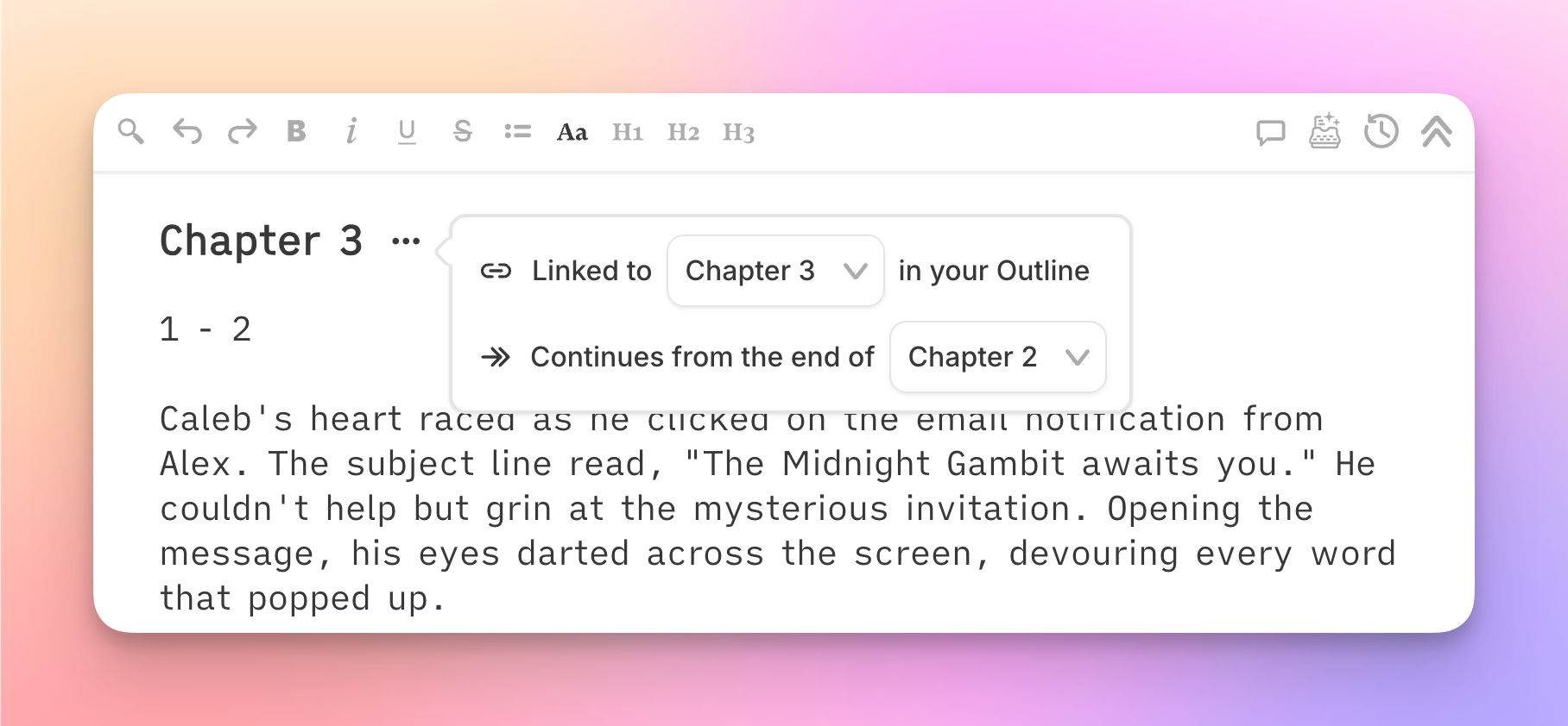 Here's where Chapter Continuity does its real work. You link your chapter documents in sequence, and the Write feature reads up to 20,000 words of preceding text across those linked chapters. Not summaries. Not keywords. Your actual prose. So when Chapter 15 references an event from Chapter 3, the AI has Chapter 3's text in its context window. Timeline errors and forgotten threads drop dramatically because the AI is reading the same story your reader will.