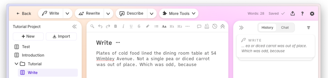 You link chapter documents in sequence, and Sudowrite's Write feature reads the preceding text automatically. Combined with Story Bible data for characters, worldbuilding, and plot outlines, the AI generates prose that's consistent with everything you've already established. No manual re-pasting between sessions.