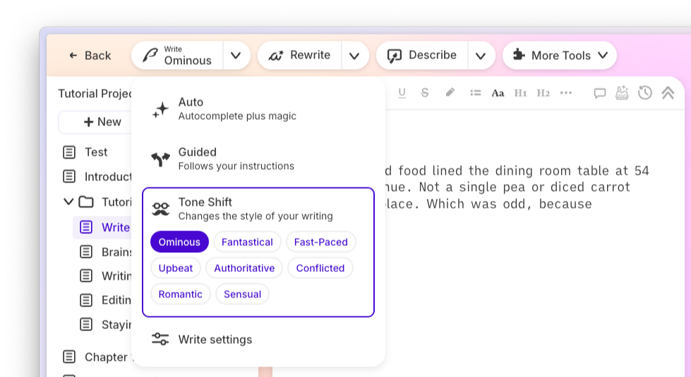 Here's the real issue: spice isn't binary. It's not "clean or dirty." The best romance novels modulate heat scene by scene. Chapter three might be a 2-pepper slow burn. Chapter twelve hits 4 peppers. Chapter twenty pulls back to a tender 1-pepper moment. You need a tool that moves with you across that spectrum, not one locked at a single setting. Sudowrite's Tone Shift feature includes Romantic and Sensual modes specifically for this kind of calibration, and the Creativity Slider lets you fine-tune risk level on every generation.
